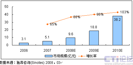 毫無(wú)疑問(wèn),3G將成為無(wú)線電郵市場(chǎng)最有利的推動(dòng)因素,3G的先進(jìn)技術(shù)和網(wǎng)絡(luò)將賦予無(wú)線電郵比普通單一短信更加豐富的應(yīng)用空間,它有望成為繼短信之后的又一個(gè)“殺手級(jí)”業(yè)務(wù)。預(yù)計(jì)未來(lái)三年,無(wú)線電郵市場(chǎng)將呈現(xiàn)爆發(fā)式的增長(zhǎng),市場(chǎng)規(guī)模將從2007年5.1億元上升到2010年的38.2億元。