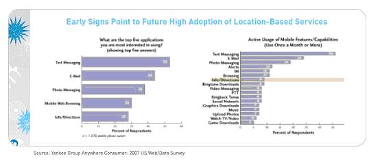 當美國聯(lián)邦通信委員會(FCC)在2001年強制要求實施911增強功能時,移動行業(yè)就開始通過將導航服務引入大眾市場來獲利。7年后,絕大多數(shù)手機都集成了GPS功能,幾大主要的移動運營商也都計劃在年內(nèi)推出至少一項基于GPS 的導航應用。揚基集團認為,2008年正在成為美位置服務的轉(zhuǎn)折點。
