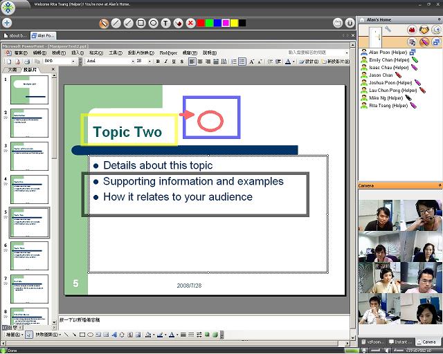 2.在多人會議的環(huán)境下,vzRoom同時支持多種實時信息分享,包括網頁、相片、文件、圖表和簡報等,配合內置畫筆功能,方便解說。