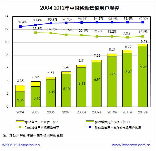 艾瑞咨詢根據(jù)工信部統(tǒng)計的中國移動電話用戶數(shù)量并結(jié)合行業(yè)研究發(fā)現(xiàn),2008年中國移動電話用戶數(shù)將達(dá)6.5億,同比增長19.0%,而2008年中國移動增值用戶規(guī)模預(yù)計將達(dá)6.13億人,相比2007年的5.10億同比增長20.2%,占中國移動電話用戶規(guī)模的94.1%。預(yù)計到2009年中國移動增值用戶規(guī)模將達(dá)到6.91億人,而到2012年將突破9億人。