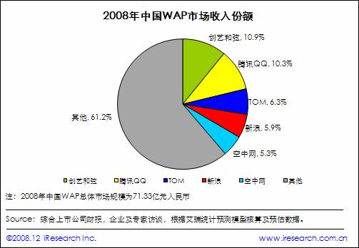 艾瑞咨詢研究發(fā)現(xiàn),08年WAP市場集中度較2007年有所提升,TOP5廠商占據(jù)份額已達(dá)38.8%,其中創(chuàng)意和弦、騰訊QQ、TOM分別以10.9%、10.3%和6.3%的比例位居前三。