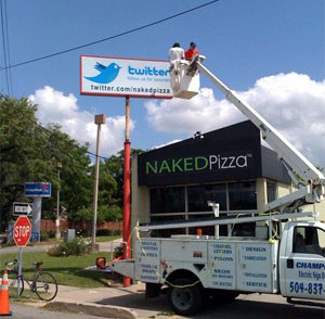 繼華爾街日?qǐng)?bào)、紐約時(shí)報(bào)、英國(guó)衛(wèi)報(bào)等報(bào)紙利用起Twitter后,最近,據(jù)Techcrunch網(wǎng)站消息稱,美國(guó)新奧爾良名為NakedPizza的比薩店,不僅在Twitter上注冊(cè)了帳號(hào),而且拆除了之前標(biāo)有訂餐電話的店前廣告牌,取而代之的是一塊以Twitter為主題的新廣告牌。