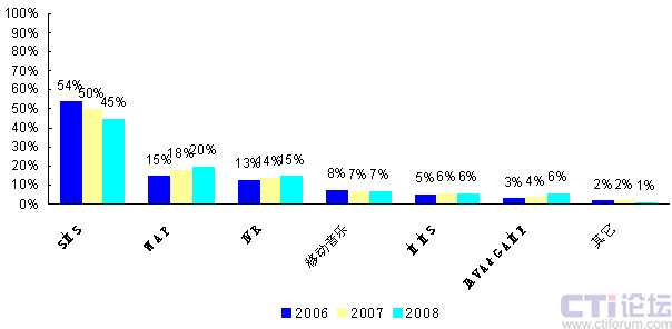 圖1 2006~2008年中國移動數(shù)據(jù)業(yè)務市場結構(單位:%)