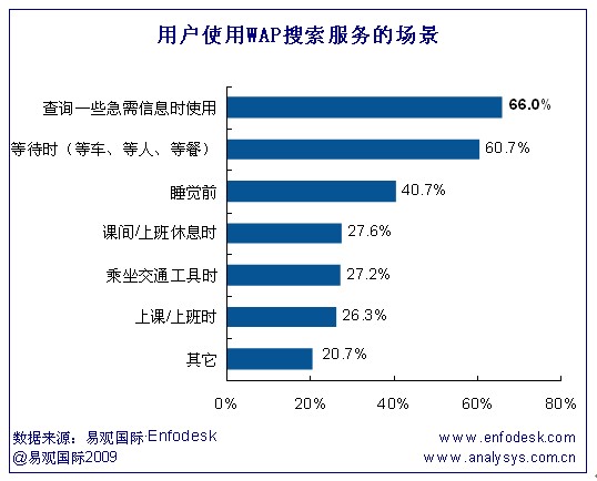 根據(jù)易觀Enfodesk《中國(guó)移動(dòng)搜索市場(chǎng)用戶調(diào)研報(bào)告2009》研究發(fā)現(xiàn),用戶使用WAP搜索服務(wù),一般情況是在查詢一些急需信息和等待時(shí)(等車、等人、等餐),這兩類情形的使用比例均在60%以上。值得注意的是,在睡覺前,用戶使用移動(dòng)搜索服務(wù)的比例達(dá)40.7%。而在其他休閑時(shí)間,如課間/上班休息時(shí)、乘坐交通工具、上課/上班時(shí)也是用戶經(jīng)常使用WAP搜索服務(wù)的場(chǎng)景。