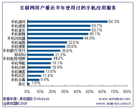 互聯(lián)網(wǎng)用戶近半年使用過的手機應(yīng)用按比例排列依次是手機游戲、手機閱讀、手機搜索、手機瀏覽器、移動IM。其中移動互聯(lián)網(wǎng)用戶對手機游戲的使用率和互聯(lián)網(wǎng)用戶相當,達64.3%。具體如上圖: