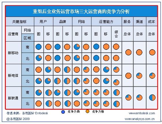 盡管產(chǎn)業(yè)鏈完備程度相差較為明顯,但運營商各自業(yè)務(wù)與用戶服務(wù)運營能力對3G時常的發(fā)展影響也至關(guān)重要,根據(jù)易觀國際Enfodesk發(fā)布的《國內(nèi)運營商3G業(yè)務(wù)發(fā)展策略研究系列—中國3G市場現(xiàn)狀與發(fā)展策略概述》報告顯示,在發(fā)展3G的過程中,三大運營商各自有一定的優(yōu)劣勢: