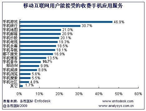 CTI論壇(ctiforum)06月22日消息:據易觀國際(Analysys International)《中國手機應用市場用戶調研報告2009》研究發(fā)現,移動互聯(lián)網用戶可接受收費的應用主要是手機游戲和手機銀行/支付,其比例分別為47%和31%,而手機游戲也是移動互聯(lián)網用戶使用比例較高的手機應用服務之一。另外,用戶可接受程度較高的還包括手機郵箱、手機導航、手機炒股、手機電視/視頻以及手機殺毒等應用。而移動互聯(lián)網用戶對于手機社區(qū)和手機搜索收費的接受度較低。研究發(fā)現,移動互聯(lián)網用戶可接受收費的應用主要是手機游戲和手機銀行/支付,其比例分別為47%和31%,而手機游戲也是移動互聯(lián)網用戶使用比例較高的手機應用服務之一。另外,用戶可接受程度較高的還包括手機郵箱、手機導航、手機炒股、手機電視/視頻以及手機殺毒等應用。而移動互聯(lián)網用戶對于手機社區(qū)和手機搜索收費的接受度較低。