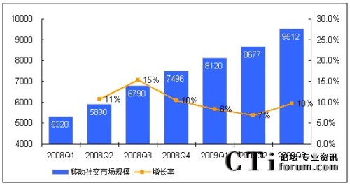CTI論壇(ctiforum)12月8日消息(記者 楊?lèi)偅?馳昂咨詢(xún)(Sinotes)發(fā)布的《2009年中國(guó)移動(dòng)互聯(lián)網(wǎng)業(yè)務(wù)市場(chǎng)監(jiān)測(cè)-第三季度》報(bào)告數(shù)據(jù)顯示,2009年Q3中國(guó)移動(dòng)社交業(yè)務(wù)市場(chǎng)規(guī)模才超過(guò)9000萬(wàn)元,達(dá)9512萬(wàn)元,直逼億元大關(guān)。與2009年Q2相比,增長(zhǎng)率達(dá)10%。預(yù)計(jì)其年增長(zhǎng)率將超過(guò)30%。