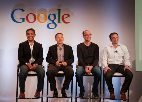 圖:參加發(fā)布會的嘉賓從左至右分別為摩托羅拉CEO桑杰·賈、宏達(dá)電CEO周永明、谷歌Android主管魯賓和谷歌產(chǎn)品發(fā)展副總裁奎羅斯