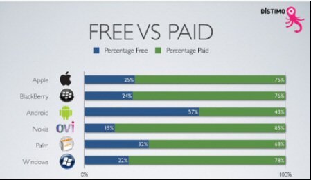 業(yè)內(nèi)人士認(rèn)為,之所以出現(xiàn)這種情況,或許是因為谷歌最早只面向免費應(yīng)用開放Android應(yīng)用商店,后來才允許開發(fā)人員推出付費應(yīng)用。蘋果和黑莓的免費應(yīng)用比例比較接近,分別為25%和24%。此外,Palm的這一比例為32%,Windows