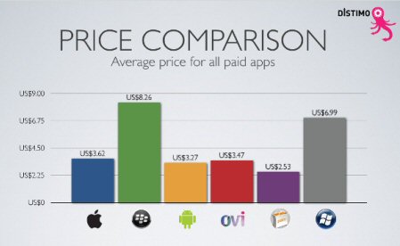 Mobile的應(yīng)用平均售價也較高,為6.99美元,諾基亞Ovi為3.47美元,Palm僅為2.53美元。