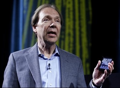 圖:Sprint CEO丹·海斯(Dan Hesse)在美國(guó)無(wú)線(xiàn)通信展上展示宏達(dá)電新手機(jī)Evo 4G