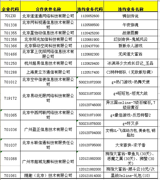 依據(jù)省移動公司上報調(diào)查發(fā)現(xiàn),下列合作伙伴存在違約行為,依據(jù)《中國移動游戲業(yè)務(wù)合作伙伴信用積分管理辦法V2.0》,處理如下: