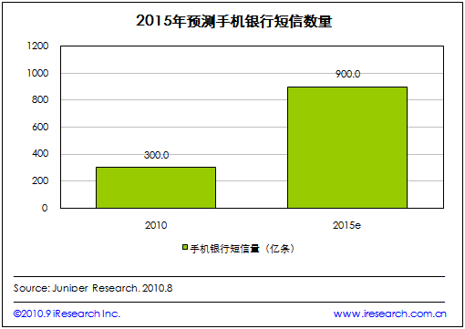 艾瑞咨詢根據Juniper Research發(fā)布的預測數據發(fā)現,由于新類型的手機銀行短信提醒的應用,到2015年,全球手機銀行短信量將達到900億條每年,相當于每個手機銀行用戶每隔一天就會收到一條銀行發(fā)來的信息。