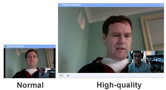 這個(gè)圖片顯示了以前和現(xiàn)在的視頻聊天窗口的對(duì)比。左邊是Gmail中老式的標(biāo)準(zhǔn)視頻聊天窗口。右邊是新的、高質(zhì)量的視頻聊天窗口,對(duì)于寬屏顯示屏是非常合適的。