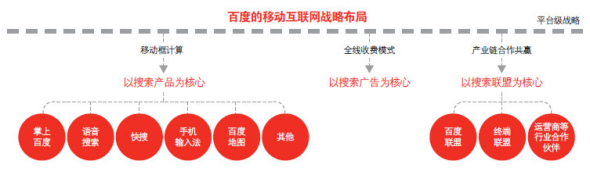 百度無(wú)線的戰(zhàn)略仍將以搜索作為核心!鞍俣仍跓o(wú)線方面的核心發(fā)展規(guī)劃就三條:第一條,以搜索產(chǎn)品為核心布局移動(dòng)框計(jì)算。第二條,以搜索廣告位核心,探索全線收費(fèi)模式。第三條,以搜索聯(lián)盟為核心,推動(dòng)產(chǎn)業(yè)鏈合作共贏!边@是百度的官方說(shuō)法。