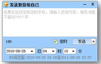 迷你飛信1.0 beta版另一大亮點(diǎn)就是類似于“移動(dòng)小秘書”的自我短信定時(shí)發(fā)送功能。用戶只需直接在好友列表或使用快捷鍵“Ctrl+Alt+W”,就打開(kāi)了給自己發(fā)送定時(shí)短信的窗口。這一功能將滿足用戶通過(guò)飛信進(jìn)行“短信提醒”的使用需求。