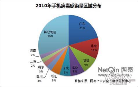 感染地域方面,《2010年中國大陸地區(qū)手機(jī)安全報告》指出,2011年我國廣東地區(qū)以21%的感染比例,成為手機(jī)病毒的感染重災(zāi)區(qū),北京,上海,福建、江蘇等地位居其后。沿海發(fā)達(dá)地區(qū),已成為手機(jī)病毒的感染重災(zāi)區(qū)。