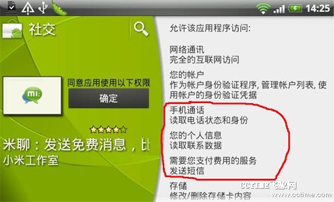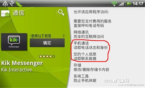 國(guó)內(nèi)外Kik類(lèi)應(yīng)用也逐漸興起,騰迅最近也加入此陣營(yíng)并推出其下產(chǎn)品微信。Kik類(lèi)應(yīng)用主要以用戶(hù)手機(jī)中聯(lián)系人目錄為主要的關(guān)系抓取,只要其聯(lián)系人中裝入該客戶(hù)端,用戶(hù)無(wú)需特意添加即可開(kāi)始類(lèi)似短信的聊天。以KikMessenger為例,其中便涉及讀取用戶(hù)聯(lián)系人信息、電話(huà)狀態(tài)和身份等權(quán)限。