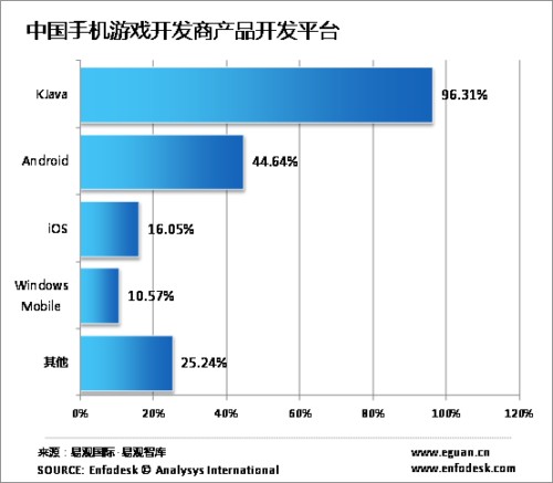 根據(jù)易觀國際的數(shù)據(jù)顯示,截至2010年底,中國手機(jī)游戲用戶規(guī)模突破1.3億,同比增長52.11%,同期中國手機(jī)游戲市場(chǎng)規(guī)模達(dá)33億,伴隨著整體市場(chǎng)的發(fā)展手機(jī)游戲開發(fā)商隊(duì)伍也逐漸完善;為了更好的研究手機(jī)游戲市場(chǎng),近期易觀國際對(duì)手機(jī)游戲開發(fā)商進(jìn)行調(diào)研,推出《中國手機(jī)游戲開發(fā)商研究報(bào)告2010》,以期對(duì)手機(jī)游戲市場(chǎng)提供有價(jià)值的信息,通過調(diào)研發(fā)現(xiàn)KJava依舊是中國手機(jī)游戲開發(fā)商的主要開發(fā)平臺(tái)。