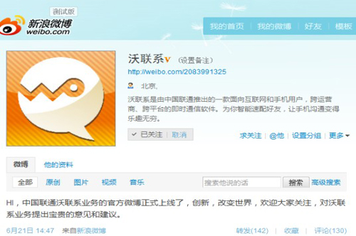 昨日下午,中國(guó)聯(lián)通“沃聯(lián)系”業(yè)務(wù)官方微博正式上線,而在稍后晚間,中國(guó)聯(lián)通官方微博也對(duì)此微博進(jìn)行推介,并稱“中國(guó)聯(lián)通即將推出一款面向互聯(lián)網(wǎng)和手機(jī)用戶,跨運(yùn)營(yíng)商、跨平臺(tái)的即時(shí)通信軟件‘沃聯(lián)系’。為幫助用戶朋友更好了解和使用這款即將上線的產(chǎn)品,中國(guó)聯(lián)通沃聯(lián)系產(chǎn)品組現(xiàn)已開通@沃聯(lián)系新浪官方微博,敬請(qǐng)關(guān)注!