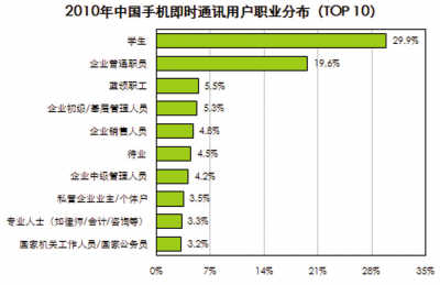 一系列研究數(shù)據(jù)足以說明些問題。研究公司艾瑞咨詢報(bào)告數(shù)據(jù)顯示,2010年中國手機(jī)上網(wǎng)用戶達(dá)到3.03億,在總網(wǎng)民數(shù)中占比約為66.3%。這其中,57.4%的用戶使用即時(shí)通訊服務(wù),位列手機(jī)上網(wǎng)用戶十大行為的第二位。