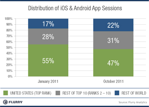 使用iOS和Android設備和其他新技術一樣,最早開始于可支配收入較高的北美和西歐地區(qū)。然而,隨著型號較舊的iOS產(chǎn)品價格下降,以及Android設備的生產(chǎn)商提供了更多大家買得起的低價設備,包括新興市場在內(nèi)的國際市場的消費者越來越多。下圖顯示了移動應用下載如何擴張到美國之外。