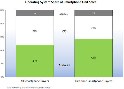 Android和iPhone一共占據(jù)了第四季度智能手機(jī)銷(xiāo)售總量的90%。Android在四季度依舊保持了48%的智能手機(jī)市場(chǎng)份額,同時(shí)Android設(shè)備在首次購(gòu)買(mǎi)智能手機(jī)的消費(fèi)者群中表現(xiàn)更好。根據(jù)NPD每月提供的Smartphone Track服務(wù)的最新數(shù)據(jù),所有在第四季度初次購(gòu)買(mǎi)智能手機(jī)的消費(fèi)者中,其中57%的消費(fèi)者選擇了Android設(shè)備,而相比較下只有34%的消費(fèi)者選擇了iPhone。