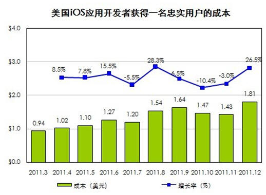 國際著名APP市場營銷組織Fiksu最新的研究數(shù)據(jù)或許能出答案。2011年12月iOS應(yīng)用開發(fā)者獲得一名忠實(shí)用戶的成本達(dá)到1.81美元,創(chuàng)下歷史新高。而在2011年第一季度,獲得一名用戶的平均成本為0.94美元,一年間單個(gè)用戶成本翻了一倍。當(dāng)用戶對蘋果商店里花樣繁多的游戲開始麻木,就需要借助有針對性的推廣策略和強(qiáng)大的執(zhí)行,讓產(chǎn)品脫穎而出。如今忠實(shí)用戶成本的提高,使得幾乎所有開發(fā)者乃至小團(tuán)隊(duì)都畏懼前期的市場推廣,大中型開發(fā)公司可利用自身的資源循環(huán)造血拉動(dòng)用戶,越是小的開發(fā)團(tuán)隊(duì)成功的幾率就越渺茫,而被吞并的可能性則大增。