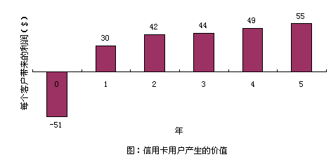 以信用卡服務(wù)為例,爭取一個(gè)新的用戶平均要51美圓,用于廣告、推銷和開戶等開支。用戶開始時(shí)花錢很少,但為公司帶來一定的利潤。但如果用戶繼續(xù)使用到第二年,就會(huì)為公司帶來更多的經(jīng)濟(jì)效益,因?yàn)楣九c客戶之間的信任和客戶對(duì)公司的滿意,致使客戶更多地通過信用卡消費(fèi)。(圖:"信用卡用戶產(chǎn)生的價(jià)值")用戶貢獻(xiàn)在增加,公司的運(yùn)作費(fèi)用卻在不斷減低。信用卡公司可以不斷減少對(duì)客戶信用的審核時(shí)間。保持長期的客戶關(guān)系,還可以減少廣告支出,客戶本身就是一個(gè)免費(fèi)的廣告資源。很多人在消費(fèi)前喜歡聽取朋友的意見,覺得比廣告更可信。