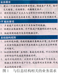 為了獲得真正智能化的企業(yè)客戶(hù)管理,信息結(jié)構(gòu)必須與商業(yè)智能無(wú)縫集成。圖1描述了與信息結(jié)構(gòu)相關(guān)的業(yè)務(wù)需求。這種需求和結(jié)構(gòu)引起的信息技術(shù)問(wèn)題使得實(shí)現(xiàn)真正的集成化迫在眉睫。