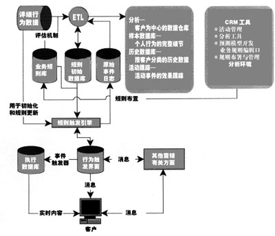 關(guān)系數(shù)據(jù)庫(kù)系統(tǒng)有三種主要數(shù)據(jù):典型客戶(hù)案例的詳細(xì)數(shù)據(jù)、對(duì)所有客戶(hù)的總結(jié)性歷史數(shù)據(jù)以及具體活動(dòng)的數(shù)據(jù)。分析數(shù)據(jù)庫(kù)提供輸入數(shù)據(jù),從而得到對(duì)客戶(hù)的認(rèn)識(shí),而滿(mǎn)足ETL處理的業(yè)務(wù)規(guī)則庫(kù)為分析數(shù)據(jù)庫(kù)提供派生屬性。這個(gè)過(guò)程將保持離線(xiàn)分析和實(shí)時(shí)事件觸發(fā)規(guī)則之間的同步,在動(dòng)態(tài)建立表格的過(guò)程中處理初始化完成后的派生屬性相加,并對(duì)相應(yīng)的元數(shù)據(jù)進(jìn)行更新,這些處理都是自動(dòng)實(shí)現(xiàn)的。