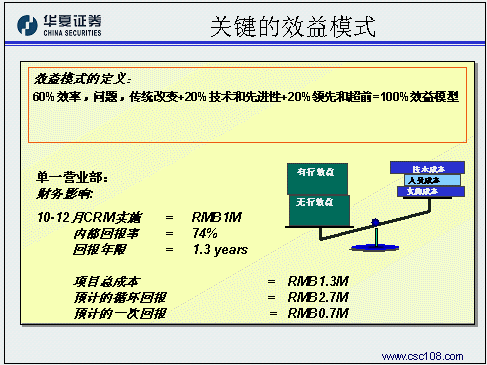 華夏證券經(jīng)紀業(yè)務(wù)總部的姚磊作為唯一的成功應(yīng)用案例代表,主要是和與會的金融機構(gòu)分享在客戶關(guān)系管理規(guī)劃方面的一些成功經(jīng)驗。華夏證券認為,對于證券公司的經(jīng)紀業(yè)務(wù)來講,客戶關(guān)系管理的主要目標應(yīng)該是把客戶關(guān)系管理系統(tǒng)的核心功能融入開戶、交易、服務(wù)、咨詢等四個與客戶互動的過程之中,比如:客戶資料規(guī)戶整合形成統(tǒng)一的客戶號,管理客戶交易偏好和產(chǎn)品偏好上的變化,配合多種渠道建立一對一銷售流程,客戶終身價值管理。在風(fēng)險控制方面,華夏證券同樣貢獻了寶貴的經(jīng)驗,在這方面他們認為最重要的方面是要做好高層領(lǐng)導(dǎo)的灌輸和培訓(xùn)工作,讓企業(yè)的高層領(lǐng)導(dǎo)對于客戶關(guān)系管理有一個正確的理解,從而對于項目的投資有一個合理的預(yù)期和實證,通俗一點說,就是首先為整個項目找一個合適的發(fā)起人。第二點要注意,要有專業(yè)的項目管理隊伍,這其實就是集成商選擇方面的風(fēng)險。除此之外,還要對項目要有一個明確的定義,關(guān)注每一步提交的結(jié)果,在項目過程中就隨時發(fā)現(xiàn)問題、解決問題。