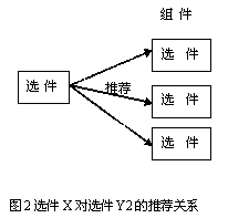 當(dāng)客戶選擇某個(gè)選件時(shí),系統(tǒng)自動(dòng)提示推薦另一選件,這種關(guān)系稱(chēng)為選件的推薦關(guān)系。比如,在配置手機(jī)產(chǎn)品時(shí),選擇了某電話選件,則推薦使用特定充電器型號(hào)選件,雖然其他類(lèi)似的選件也可以適用。如圖2所示,雖然選件X可以與組件Y內(nèi)的選件Y1,Y2,Y3搭配,但推薦使用Y2。
