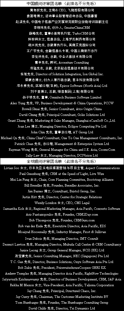 五、 權(quán)威性。GreaterChinaCRM邀請(qǐng)?jiān)摍C(jī)構(gòu)50多位(包括中國和外國)最權(quán)威的CRM專家擔(dān)當(dāng)此次評(píng)選的評(píng)審團(tuán)。