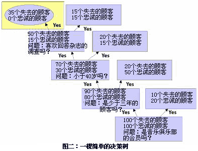 你可以從它的名字中猜到,決策數(shù)是一種樹型分析模型。樹枝代表了用來定義或者細(xì)分客戶的不同問題。比如,假設(shè)一家音樂俱樂部想要分析為什么一些會員不會再次申請它的會員資格(該俱樂部會員采取月申請制)。為了形成決策樹,公司召集了一批由100個忠誠顧客、100個非忠誠或者已經(jīng)公司已經(jīng)失去的顧客組成的測試小組。然后,公司開始提出一系列問題,要求顧客形容一下忠誠的顧客和非忠誠的顧客是什么樣子的。整個決策樹就如圖二所示。