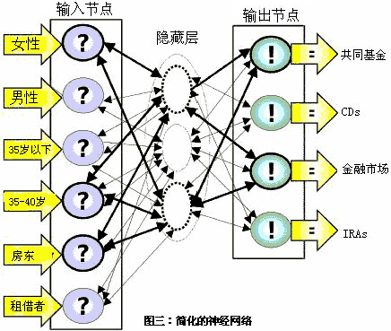假設(shè)該集團(tuán)的數(shù)據(jù)組包括了100000個現(xiàn)有和潛在的顧客。數(shù)據(jù)組中所有成員至少滿足一個列示于每個輸出節(jié)點(diǎn)邊上的特征條件,比如說,他們的年齡小于35歲或者是在35-40之間,男性或者女性,房東或者租借人。BPN從所有的輸入節(jié)點(diǎn)中獲得數(shù)據(jù),并且以此編譯一個預(yù)測型模型。這個簡單的模型告訴使用者,年齡在35-40歲之間的男性房東最有可能購買共同基金和金融市場產(chǎn)品。這是BNP能預(yù)測的信息。