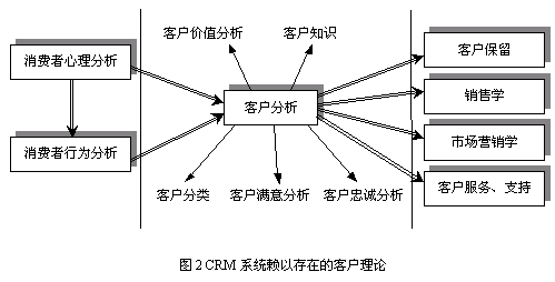 大多數(shù)CRM研究人員和應(yīng)用專家不認為CRM存在作為應(yīng)用支撐的理論基礎(chǔ),充其量認為CRM只是支持企業(yè)營銷的商業(yè)策略。隨著企業(yè)追求市場活動績效的熱情的提高,企業(yè)開始采用定性和定量的分析方法決策其與市場和客戶有關(guān)的企業(yè)活動,如有效的客戶滿意度評價、客戶分類、客戶盈利率分析等。而這些決策迫切需要相關(guān)的理論基礎(chǔ)為指導(dǎo),真正擺脫靠經(jīng)驗進行決策的做法。當(dāng)前CRM的理論研究和學(xué)術(shù)探討并未真正走向體系化、統(tǒng)一化,所以造成CRM市場中提供的功能參差不齊。CRM系統(tǒng)必須存在一個完整的理論體系為指導(dǎo),本文將CRM系統(tǒng)賴以存在的理論基礎(chǔ)統(tǒng)稱為客戶理論(Theory on Customer)。