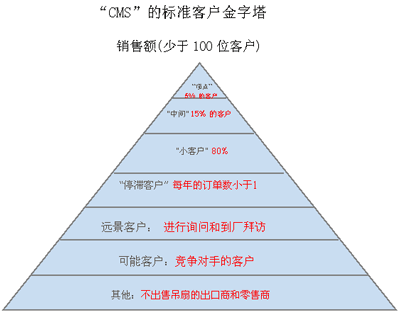 搜集了去年的銷(xiāo)售數(shù)量之后,“CMS”得出了以下的客戶金字塔。由于高端20%的核心客戶占總收入的80%,因此使用以上的方法來(lái)保留他們很重要。除此之外,對(duì)該公司來(lái)說(shuō)通過(guò)獲取歐洲和南美地區(qū)的新客戶來(lái)增加客戶基數(shù)也是十分必要的。