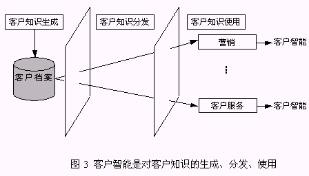 客戶知識是人們通過實踐認(rèn)識到的、與客戶有關(guān)的規(guī)律性,而客戶智能是獲得客戶知識并使用客戶知識求解問題的能力?蛻糁悄苁菍ζ髽I(yè)戰(zhàn)略決策真正有價值的事物和行動?蛻糁悄懿粌H包括了客戶知識的生成,而且更強(qiáng)調(diào)了客戶知識在企業(yè)中的分發(fā)、使用,直到產(chǎn)生客戶智能。所以,客戶智能是對客戶知識的生成、分發(fā)和使用(圖3)。