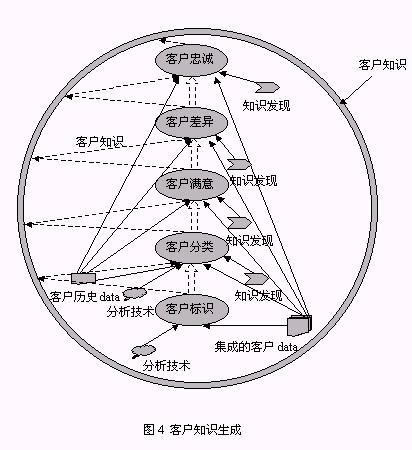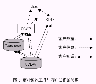 從以上構(gòu)成系統(tǒng)的三個組件的介紹中同時可以找到對以下兩個問題的答案:1、客戶數(shù)據(jù)、客戶信息、客戶知識之間的區(qū)別(圖5):由來自于事務(wù)系統(tǒng),如ERP、SFA等的源數(shù)據(jù)經(jīng)整理后放入CCDW或數(shù)據(jù)集市,這一過程處理的對象稱為客戶數(shù)據(jù);OLAP為決策人員提供了展示有意義的客戶數(shù)據(jù)的機(jī)制,這種有意義的客戶數(shù)據(jù)稱之為客戶信息;客戶數(shù)據(jù)和客戶信息均可以通過KDD技術(shù)的運用,提升為對決策有價值的客戶知識。2、客戶知識生成的途徑:從對第一個問題的解答中可以知道,客戶知識從KDD作用的對象來看有兩種途徑:KDD作用于客戶數(shù)據(jù)、KDD作用于客戶信息,總之,客戶知識生成是依賴于KDD過程的復(fù)雜的過程。
