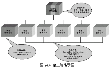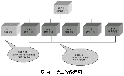 這一階段首先確立一個點(華北銷售公司),這個點的選擇要考慮多方面的因素,比如員工素質(zhì)、電腦應(yīng)用水平以及基礎(chǔ)設(shè)施等。第一階段目標的實現(xiàn)對整個項目關(guān)系重大,是一個示范性的實施,對維持管理層和員工對CRM項目的信心具有重要的意義。