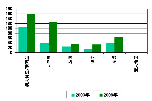亞太區(qū)(日本除外)的CRM應(yīng)用市場(chǎng)中,澳大利亞繼續(xù)處于主導(dǎo)地位,2003年市場(chǎng)規(guī)模為9,740萬美元,據(jù)IDC預(yù)測(cè),2008年有望增至1.452億美元,未來五年的年復(fù)合增長率將達(dá)到8%。中國以2,580萬美元的CRM應(yīng)用市場(chǎng)收入居其次,且IDC預(yù)測(cè),2008年的市場(chǎng)收入將達(dá)1.086億美元,未來五年的年復(fù)合增長率為33%。此外,中國金融、電信等服務(wù)行業(yè)的市場(chǎng)化,迫使這些行業(yè)為了保持競(jìng)爭(zhēng)能力而增強(qiáng)CRM技術(shù)的應(yīng)用,這是CRM應(yīng)用在金融和電信行業(yè)的普及、從而帶動(dòng)中國CRM應(yīng)用市場(chǎng)迅猛增長的原因。另外,進(jìn)駐中國的外資企業(yè)在CRM方面的投入也帶動(dòng)了需求的增長。亞太區(qū)(日本除外)第三大CRM應(yīng)用市場(chǎng)是韓國,2003年市場(chǎng)收入約為2,500萬美元,2008年有望增至3,390萬美元,未來五年的年復(fù)合增長率6%。