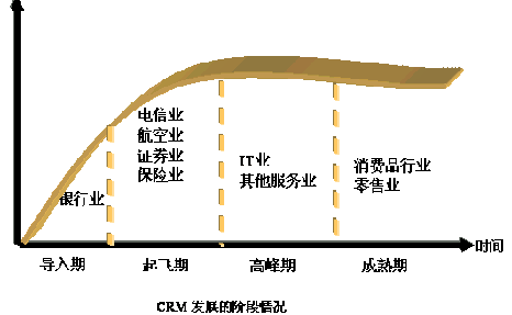 從圖中我們可以大致看出CRM的發(fā)展情況。保險(xiǎn),電信行業(yè)對(duì)這比較重視,而且得到了一定的應(yīng)用。但是在其他行業(yè)中的發(fā)展仍然比較緩慢。面對(duì)中國(guó)的龐大市場(chǎng),從CRM的發(fā)展中不難看出:會(huì)隨著經(jīng)濟(jì)的發(fā)展得到長(zhǎng)足的發(fā)展。隨著經(jīng)歷早期客戶(hù)是蒙昧期,后來(lái)是觀(guān)察期,現(xiàn)在是選擇期,CRM市場(chǎng)可能出現(xiàn)爆炸性的增長(zhǎng)。CRM本身是很好的,發(fā)展到一定階段,引導(dǎo)期已經(jīng)過(guò)了,又會(huì)發(fā)展起來(lái)。