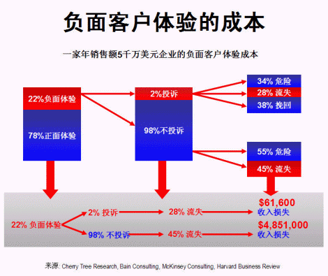 一家年銷售額五千萬美元的企業(yè),假設(shè)正面客戶體驗(yàn)為78%,負(fù)面體驗(yàn)為22%,在所有負(fù)面體驗(yàn)中,只有2%的客戶投訴,其余98%大多數(shù)均不投訴,保持沉默(這與現(xiàn)實(shí)情況頗為吻合)。在2%投訴客戶中,有34%經(jīng)過處理仍然未能令客戶完全滿意,尚有流失的危險(xiǎn);28%的客戶在處理后依然流失,余下38%的客戶則感到滿意,繼續(xù)留下。對大部分(98%)沒有投訴的客戶,因公司對他們的不滿意并不知情,所以沒有采取行動(dòng),55%的客戶有隨時(shí)流失的危險(xiǎn),其余45%已經(jīng)流失。