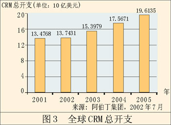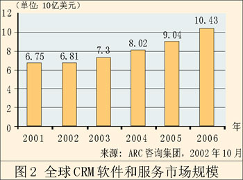 單單這還不是惟一能夠說(shuō)明問(wèn)題的。早在2002年,F(xiàn)orrester研究公司就聲稱,來(lái)自CRM的收入將從428億美元增長(zhǎng)到738億美元。AMR研究公司同樣預(yù)測(cè),這個(gè)領(lǐng)域會(huì)不斷增長(zhǎng)。AMR的調(diào)查表明,91%的公司會(huì)在這方面增加開支,預(yù)計(jì)總開支會(huì)增長(zhǎng)8%。值得一提的是,AMR所指的這一塊市場(chǎng)是“客戶管理”,而不是較為傳統(tǒng)的CRM,這說(shuō)明CRM應(yīng)用軟件的作用發(fā)生了轉(zhuǎn)變。