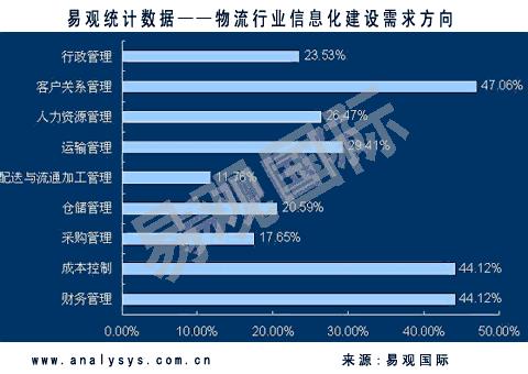易觀國際《中國物流行業(yè)信息化年度綜合報(bào)告2006》數(shù)據(jù)統(tǒng)計(jì),物流企業(yè)選擇管理信息化建設(shè)方向最迫切的需求是客戶關(guān)系管理,占到全部企業(yè)的47%以上。