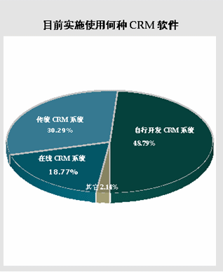 在選擇“已經(jīng)實(shí)施任一CRM軟件”的38.45%的被調(diào)查者中,有48.79%的CRM軟件使用者目前實(shí)施的是“自行開發(fā)CRM系統(tǒng)”,而選擇“傳統(tǒng)CRM系統(tǒng)”的為30.29%。雖然市場對(duì)on-demand