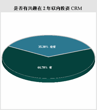 在選擇“尚未使用任一CRM軟件”的被調(diào)查者中,當(dāng)被問及基于現(xiàn)在的狀況,“是否有興趣在兩年以內(nèi)投資CRM”。有64.70%的被調(diào)查者選擇有興趣在兩年內(nèi)投資CRM軟件,而選擇沒有興趣在兩年內(nèi)投資CRM軟件的只占35.30%。盡管現(xiàn)在實(shí)際使用CRM軟件的用戶所占比例還不甚理想,但市場前景還是非?春茫蟛糠止揪哂袑(shí)施CRM軟件的需求。