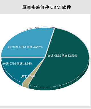 CRM軟件,或在線CRM軟件”;也有28.57%的被調(diào)查者選擇自行開發(fā)CRM軟件;相比于前面兩種類型,被調(diào)查者對(duì)傳統(tǒng)CRM軟件的需求則處于一個(gè)較低的水平,有16.36%的被調(diào)查者仍然選擇有興趣在兩年投資傳統(tǒng)的CRM軟件。雖然ASP的模式在中國市場上的認(rèn)知度仍然有限,但是市場對(duì)on-demand